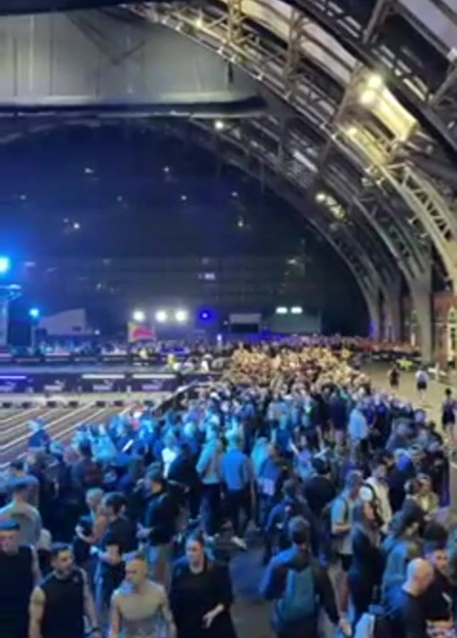 large indoor event space with a crowd of people. The venue has a high, arched ceiling with visible metal framework. There are running tracks set up, and runners can be seen using them. Blue stage lighting is visible throughout the space, and large screens are set up at the far end. The crowd appears to be a mix of athletes and spectators, with many people walking around or milling about.