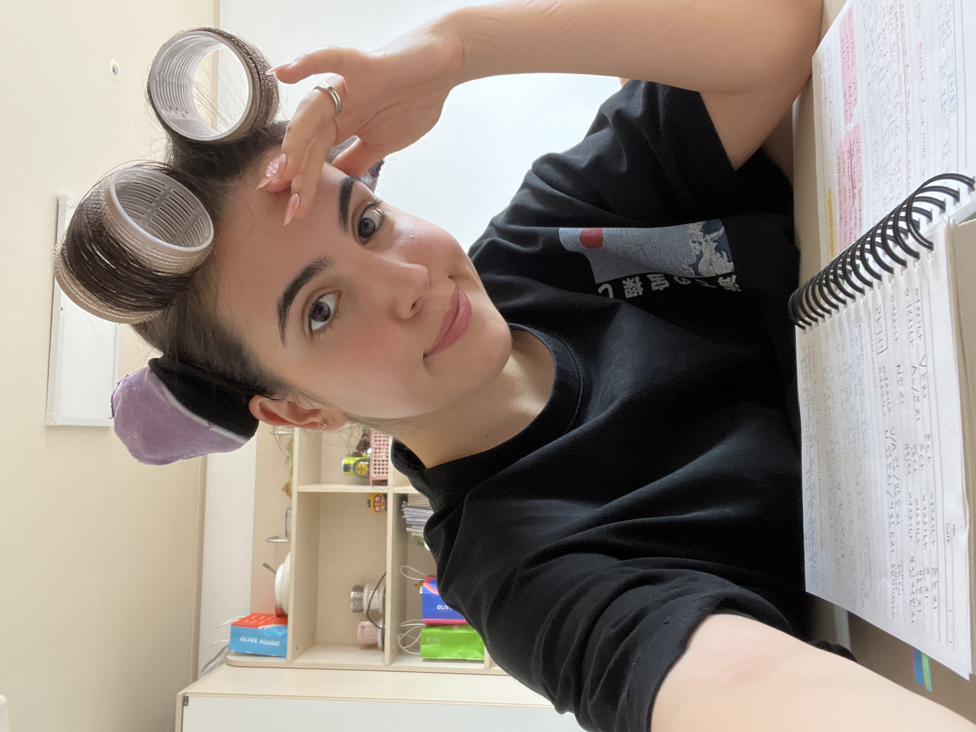 young woman with light skin and dark hair in hair rollers, posing with her hand on her forehead, appearing to be taking a selfie. She is wearing a black t-shirt with some Japanese writing and a graphic design on it. Next to her is a notebook filled with handwritten notes. The environment includes a desk with shelves holding various items such as boxes and small containers. The text "OLIVE YOUNG" can be seen on one of the boxes. The writing in the notebook indicates that the location is in Daegu, South Korea.