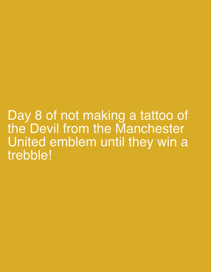 The image displays a solid, uniform mustard yellow background. In the lower central portion, white sans-serif text is present across five lines. The text reads: "Day 8 of not making a tattoo of the Devil from the Manchester United emblem until they win a treble!" No individuals, physical objects, or discernible actions are depicted. The environment is limited to the monochrome background. The image provides no visual information to determine its geographical location, including any specific city such as Sofia, Bulgaria.