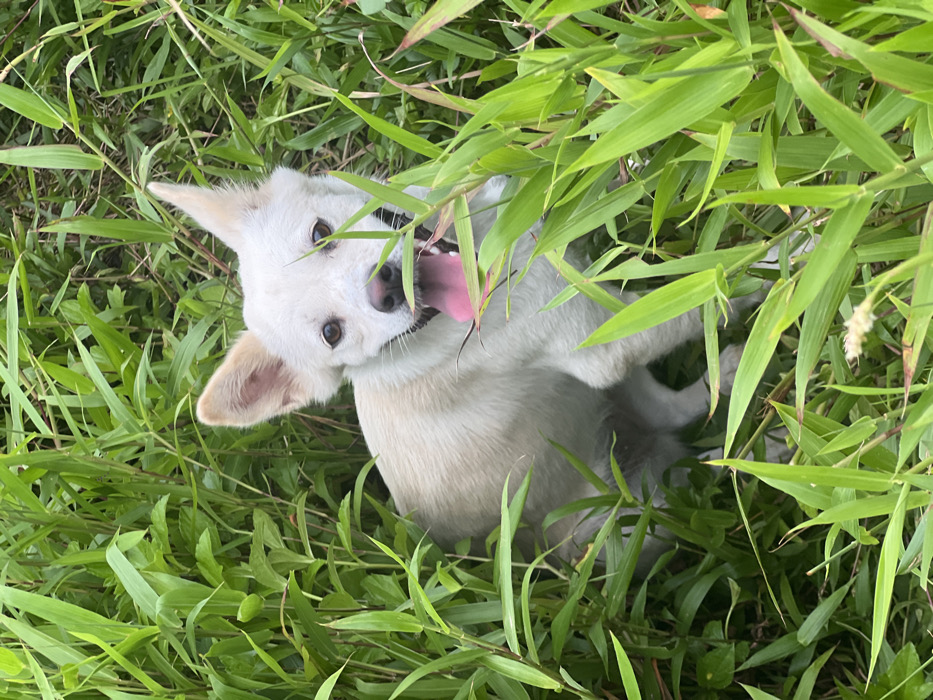 - "A medium-sized domestic canid, primarily white with light tan fur on its back and inner ears, is depicted positioned in a semi-crouched stance amidst dense, tall green foliage, likely grass or reeds" by FM-37mOy1, licensed under CC BY 4.0