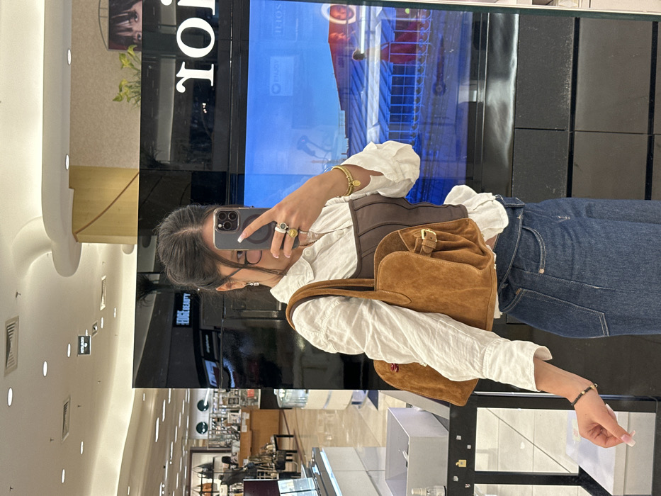 A young adult female is taking a mirror selfie inside a department store at The Forum Shops at Caesars Palace, Las Vegas, Nevada, United States. Her face is largely obscured by a silver smartphone with a multi-lens camera array, held by her right hand which displays multiple rings and a gold bracelet. She is wearing eyeglasses, a white long-sleeved collared shirt, a dark brown corset-style top, and dark blue jeans with a crossover waist design. A medium-brown, possibly suede, top-handle handbag with a buckle detail is carried on her right arm. Her left hand, adorned with a black beaded bracelet, is positioned by her side. The background reflection shows a brightly lit retail space with various merchandise displays, including a section labeled "EDGE BEAUTY" and a digital screen displaying "iLIOS" and a partial reflection of "The Forum Shops." Fluorescent lighting is visible on the ceiling, along with cream-colored support columns. A hand sanitizer bottle and a white box are on a black counter to her left.
