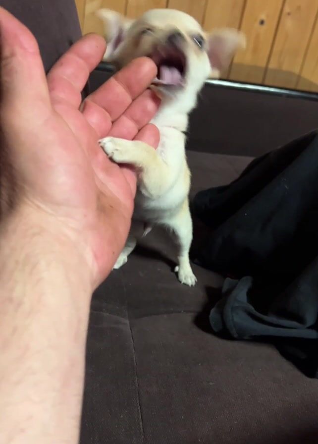 A small, pale-colored Chihuahua puppy is standing on a brown sofa. A fair-skinned human hand is partially visible, reaching toward the puppy. The puppy reacts by trying to bite or nip at the hand, then backs away slightly. The background includes wood paneling on the wall and black clothing on the sofa. The lighting is moderate and the setting appears to be indoors.