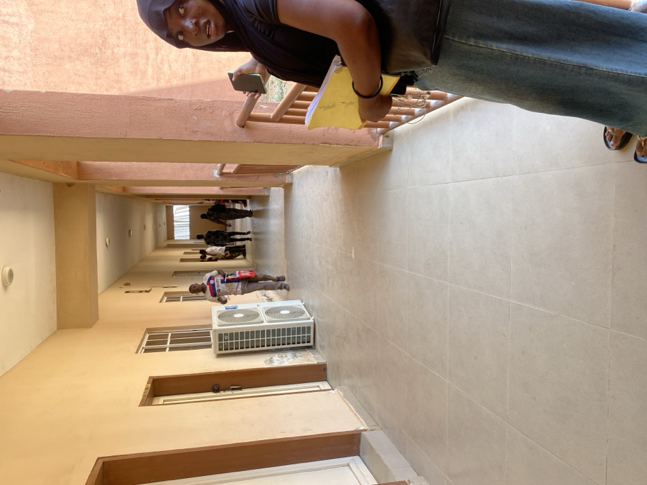 The image displays an expansive, light peach-colored corridor within a building located in Baganakwo, Nigeria