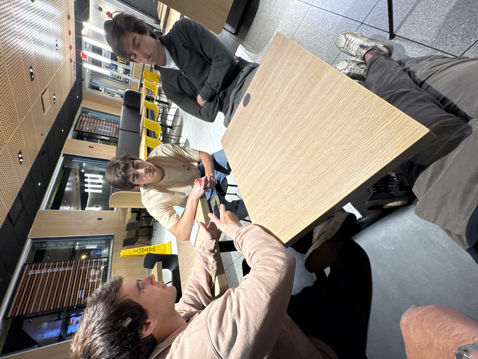The scene is an interior view of a modern McDonald's restaurant in South Bend, United States, likely during evening or nighttime hours, indicated by artificial lighting and exterior reflections through windows. The establishment features light wood-grain laminate tables, black seating booths, and individual chairs with black frames and some yellow seats. The ceiling is light-colored and perforated, equipped with recessed lighting. The floor is covered with light grey tiles. A yellow caution cone is visible in the background. Four individuals are present. Three males are fully visible, seated at two separate light wood-grain tables. The fourth individual is partially visible in the immediate foreground, indicating the perspective of the photographer. - **Subject 1 (Left):** A male with brown hair, wearing a light brown hooded sweatshirt. He is seated at a square table, holding a dark smartphone horizontally in his left hand and gesturing with his right hand while looking towards Subject 2. - **Subject 2 (Center):** A male with brown hair, wearing a light beige t-shirt and blue jeans. He is seated at the same table as Subject 1, facing him, with his hands clasped together on the table. He is looking towards Subject 1. A light-colored smartphone rests on the table in front of him. - **Subject 3 (Right):** A male with brown hair, wearing a dark grey zippered long-sleeved top over a white collar. He is seated at a separate square table, his arms crossed, and his head tilted with eyes appearing closed or downcast, indicative of rest or fatigue. - **Subject 4 (Foreground):** Only the lower legs, clad in dark trousers and light-colored sneakers, and a left forearm with a metallic watch are visible in the lower left foreground. Subjects 1 and 2 appear engaged in a verbal exchange. Subject 3's posture suggests disengagement from the immediate interaction.