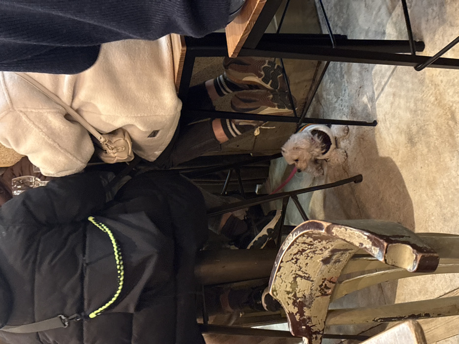 A small white dog on a pink leash sits under a restaurant table near the legs of several people. One person wears striped socks and brown shoes. Another wears black shoes and sits in an old wooden chair with peeling paint. There are multiple layers of clothing visible: a dark blue jacket, a beige puffy jacket, and a black puffy jacket with a neon green accent. A small beige purse sits next to the beige jacket.