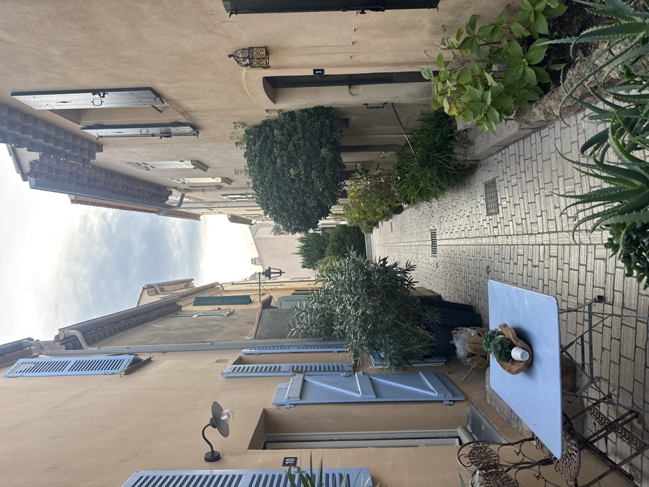 This image depicts a narrow, cobbled alleyway in the city of Saint-Tropez, France, likely in the historic quarter. The scene is devoid of people, captured in soft, diffused daylight under a partly cloudy sky. The alley, paved with light-colored rectangular cobblestones, stretches towards a receding bright light source in the distance and slopes gently upwards. Two metal drain grates are visible on the ground. On the left, a light-ochre building with a tiled roof features a recessed entrance, marked with the house number "10." The dark brown door is flanked by two sets of light-blue louvered shutters, with the lower set partially open. Above the door, a black metal wall lamp with a clear bulb extends from the facade. In the foreground, an outdoor seating area consists of a light-blue rectangular metal table and two ornate dark metal chairs. A rustic wooden bowl containing small green plants and a white ceramic pot rests on the table. Two tall, dark potted plants stand near the building, closer to the alley. Aloe vera and other green plants are visible in the immediate foreground. Further down the alley on the left side, another black metal lantern is affixed to a building facade. On the right, another light-ochre building with a similar tiled roof line stands. A dark wooden door, marked with the house number "9," is situated under a decorative wrought-iron lantern. Above, a window with dark louvered shutters is visible, one shutter partially open. A large, spherical green shrub is planted directly against the building, followed by a raised stone planter containing various green foliage. A dark metal handrail is affixed to the wall near the door. Further into the alley, additional green plants and shrubs line the building fronts, enhancing the verdant atmosphere.