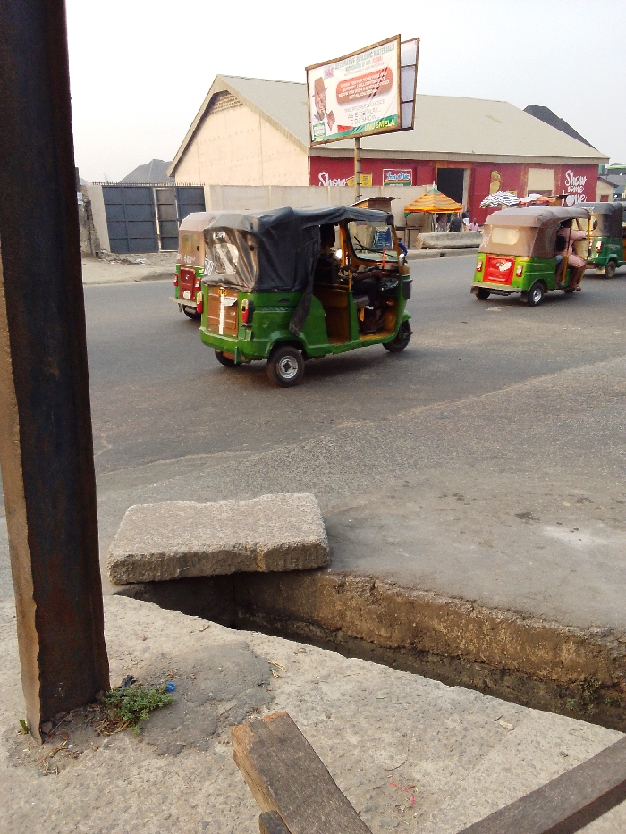 This image depicts a street scene in Umuode, Nigeria. In the immediate foreground, a weathered, dark brown, vertical metal beam stands on cracked concrete ground with sparse green vegetation. To its right, an open concrete drainage ditch runs horizontally, partially covered by a rough, rectangular concrete slab. Beyond the ditch, an asphalt road extends into the mid-ground. Three green and brown three-wheeled motor vehicles, commonly known as tuk-tuks or keke Napeps, are driving on the road from left to right. The lead vehicle is predominantly green with a dark canopy, open sides, and a visible driver. Another green and brown tuk-tuk follows closely behind, with at least one passenger visible. A third, partially obscured brown tuk-tuk is behind the second. The background features several structures. On the left, a light-colored building with a gray roof is visible, adjacent to a large, dark blue corrugated metal gate. In the center, a large billboard mounted on poles displays an advertisement featuring a man and text, including "DECORATIVE BUILDING MATERIALS" and "AKINLABI." Below the billboard and behind the moving vehicles, a red-painted building has "Show Some Love" painted on its facade. Several people are gathered near market stalls with yellow and white striped umbrellas positioned in front of this red building. The sky is a uniform, light gray.