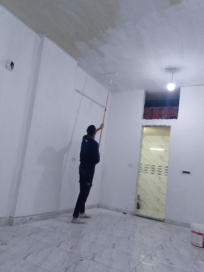 The image depicts an interior room in Ma'raba, Syria, undergoing renovation or finishing. A male individual, viewed from the back, is positioned centrally, actively painting the ceiling using a long-handled paint roller. He wears a dark long-sleeved shirt, dark pants, and light-colored shoes. The ceiling is partially covered with white paint, exposing beige or off-white unpainted sections. The walls are painted white. On the right side of the room, an open doorway reveals an adjacent space featuring light-colored, veined marble-patterned wall tiles and a horizontal light fixture. Above this doorway, an unsealed rectangular opening exposes rough, reddish-brown construction material. A single exposed light bulb hangs from the ceiling in the upper right quadrant of the primary room. Along the left wall, a horizontal fluorescent-style light fixture is mounted with exposed wiring, appearing to be partially installed. A circular vent or pipe opening is visible on the upper left wall. The floor is covered with light grey and white marble-patterned tiles, with small debris remnants scattered across the surface. White baseboards line the bottom of the walls. A white plastic paint bucket with red labeling is visible on the floor in the lower right corner. Electrical outlets or switch plates are present on the white walls.