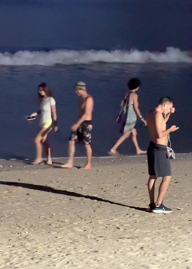 A night beach scene shows several individuals