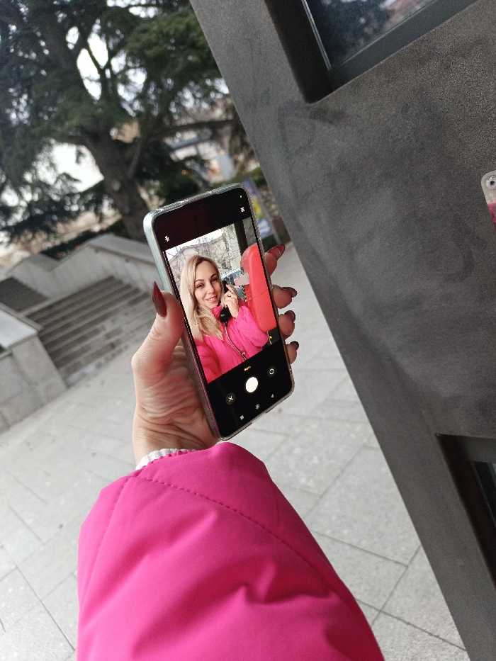 A human hand with manicured dark red fingernails and a white bracelet on the wrist holds a dark-colored smartphone in an outdoor setting. The phone's screen displays a selfie of a smiling blonde woman with long hair, wearing a bright pink jacket and holding a red retro telephone receiver to her ear; the phone's camera interface is visible on the screen. The hand-holder is also wearing a bright pink jacket with a white cuff. To the right, a dark gray, textured vertical structure with a dark rectangular opening and a metallic fixture is visible. To the left, a concrete staircase ascends, partially obscured by trees with sparse foliage. The ground consists of light-colored paving stones. The scene is located on Bolshaya Morskaya Street in Sevastopol, Ukraine, in the vicinity of the "Monument to the First Telephone."
