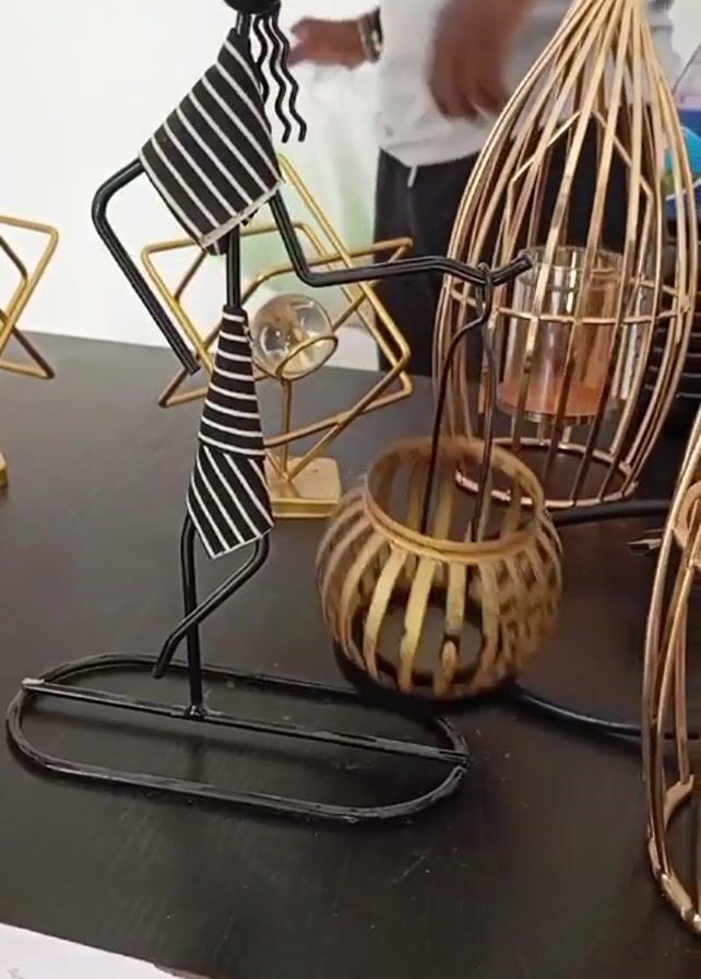 A black, modern art sculpture resembling a woman holding a tray is the focal point of this video. The sculpture is made of thin black metal, with black and white striped fabric sections for the torso. It stands on a black metal base and is surrounded by other modern art decorative pieces in gold and black. A man wearing a white shirt and black pants is visible in the background, his hands moving slightly. The objects are placed on a black table, and the background shows a white wall with a glimpse of a window. The camera angle is low and the video is stable. The overall lighting is bright and appears to be from indoor sources.