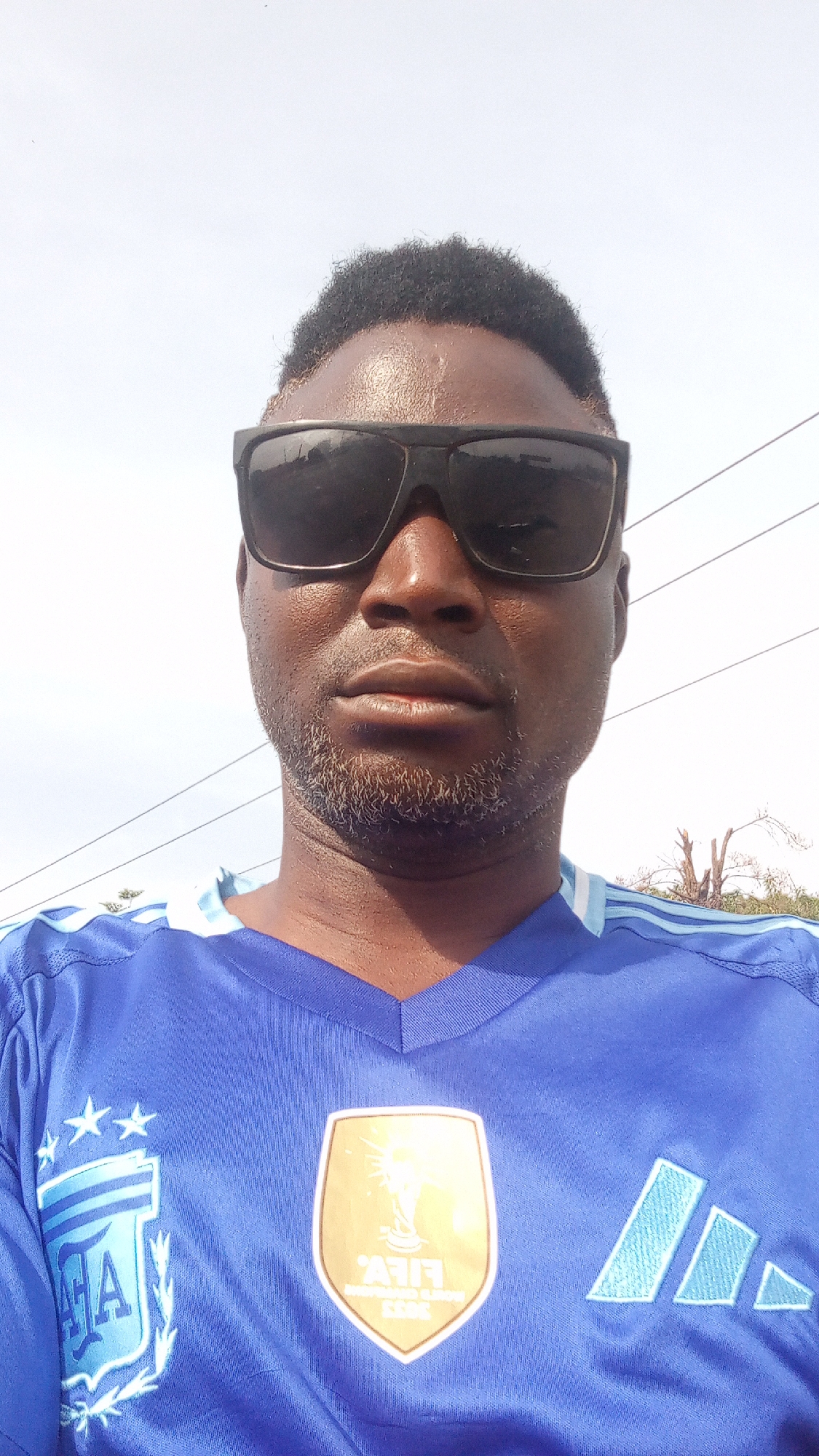 A close-up photograph features an adult male of Black ethnicity, centered and facing the camera directly. He has short, dark, curly hair, wears black rectangular sunglasses, and has a patchy, graying beard. His skin shows a slight sheen. He is wearing a V-neck, short-sleeved blue sports jersey. On the left chest, an emblem with 'AFA' and three stars is visible. On the right chest, a gold-colored shield emblem identifies him as a 'FIFA World Champions 2022' supporter, displaying the World Cup trophy. The Adidas logo, consisting of three diagonal light blue stripes, is also present on the right chest. The background is an overexposed, bright white sky with faint overhead utility lines visible. A silhouette of a leafless or sparse tree is present on the far right. The scene is outdoors in Kakuri Gwari, Nigeria.