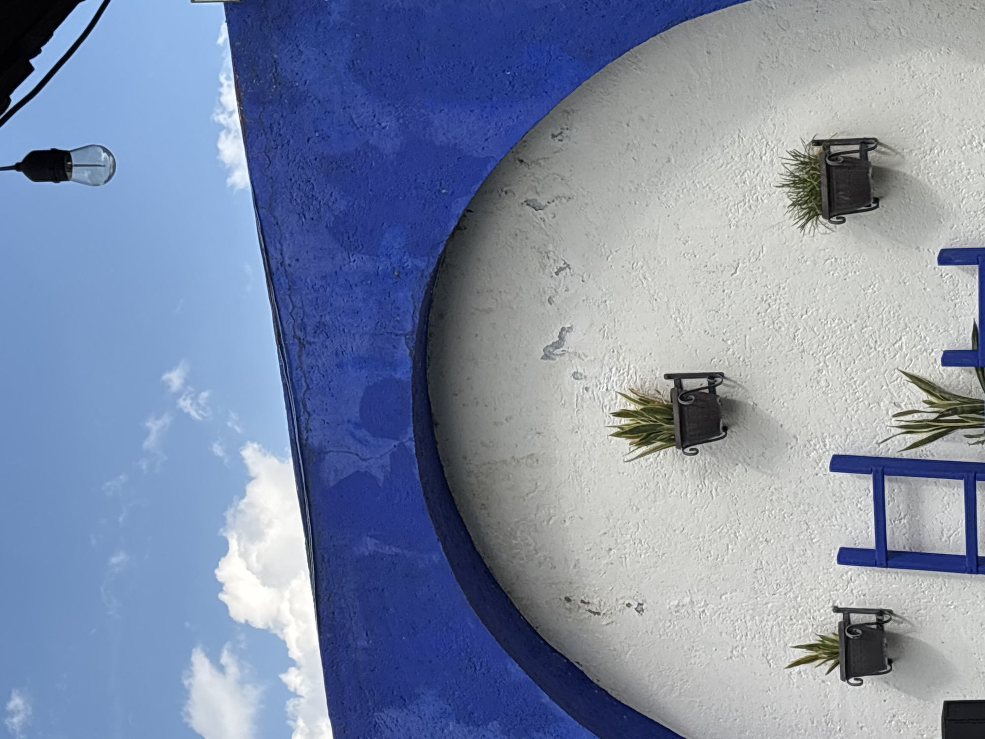 section of a building in Puebla, Mexico. The building features a curved, blue facade meeting a white wall adorned with three wrought-iron planters containing greenery. A blue decorative ladder is also affixed to the white wall. The sky, partially obscured by the building, is visible on the left with a few clouds. A lightbulb hangs from a wire in the upper left corner. The image appears to be taken from a lower angle, looking upwards.