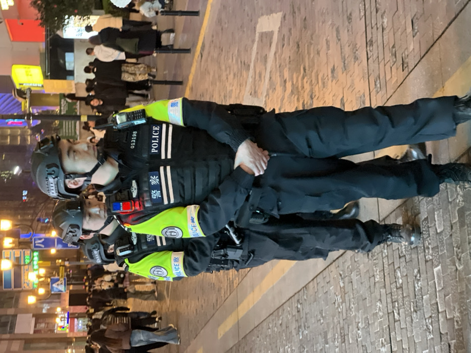 This image depicts a nighttime urban street scene in Yuzhong District, China. In the foreground, two male police officers stand in uniform. The officer on the right, closer to the viewer, wears a black tactical helmet, a black tactical vest over a black long-sleeved shirt, black cargo pants, and black boots. His uniform features fluorescent yellow-green armbands with "POLICE" and Chinese characters (警察), and his vest displays "警察," "POLICE," and the number "013198." A red and blue item is attached to his right shoulder area, and a radio communication device is on his left vest side. His hands are clasped in front of him. The second officer, positioned behind and slightly to the left, wears a similar uniform and helmet, with his head slightly bowed. A third officer's helmet is partially visible behind the second. The mid-ground and background feature a busy crowd of numerous civilians, dressed in various casual attire, walking and standing on a paved street. The environment is illuminated by multiple artificial light sources, including streetlights and commercial building lights from tall structures in the background. The ground is paved with textured stone bricks, and a yellow line is visible on the pavement in the lower left.