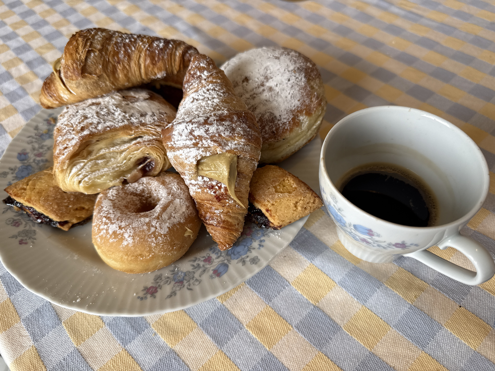 A still life photograph captures a breakfast scene, likely indoors, situated in an undetermined location in the city of Bari, Italy. A floral-patterned white plate hosts an assortment of pastries dusted with powdered sugar: two croissants (one filled with cream), a pastry filled with dark jam, a donut, and a filled donut. Adjacent to the plate, a white floral teacup is partially filled with black coffee. The scene is set on a checkered tablecloth of blue, yellow and white.