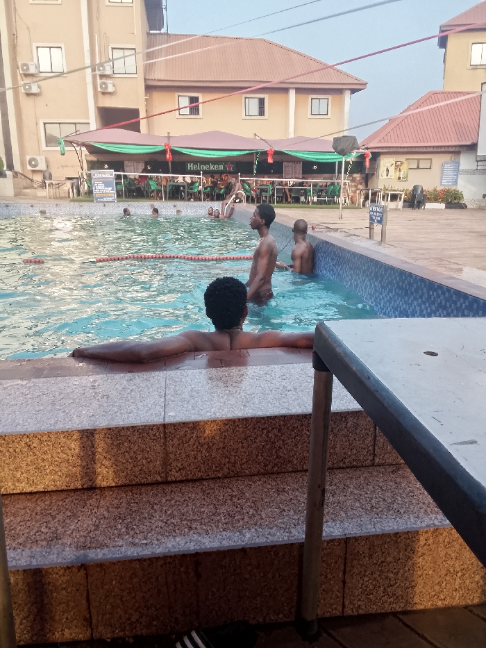 The image depicts an outdoor swimming pool and adjacent recreational facility in Onitsha, Nigeria