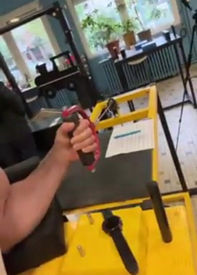 A man is recording a selfie video inside what appears to be a gym or physical therapy facility. He is bald with a mustache, wearing a white t-shirt, and has a tattoo on his left arm. In the video, he shows his arm gripping a handle connected to a yellow and black arm wrestling training machine. Behind him, two other men are standing and talking. There are windows in the background, and the walls are painted with blue and white accents. The man in the foreground appears to be demonstrating or testing the equipment. He says a series of numbers in French.