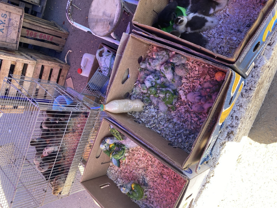 street scene with several cardboard boxes containing birds. One box holds small green and blue parrots on pink wood shavings. Another box contains many baby parrots covered in grey and green down. A cage beside the boxes holds what appears to be black and white chicks. Above these are a few ducklings in another box. There is also some furniture and wooden crates in the background. The scene appears to be an informal bird sale or market setting.