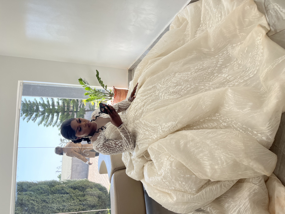 An African woman, dressed in an elaborate off-white wedding gown featuring a voluminous skirt and long, embroidered sheer sleeves, is seated indoors on a light-colored, curved sofa