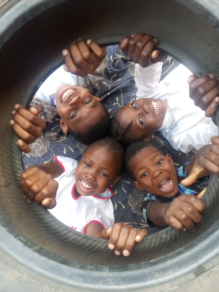 - "A group of four jubilant children are positioned inside a tire, looking up towards the camera" by FM-l9iEo2, licensed under CC BY 4.0