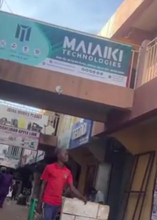 n outdoor scene in a busy commercial area. The camera first focuses on a sign that reads "MALAIKI TECHNOLOGIES" above a pedestrian walkway, then pans down to a man in a red shirt walking on the street. The scene shifts to show a red motorcycle parked near a building, and then a woman wearing a hijab sitting on a ledge near a street. In the background, there's a street scene with vehicles and people moving around. There are also buildings and structures visible in the distance, as well as power lines overhead.