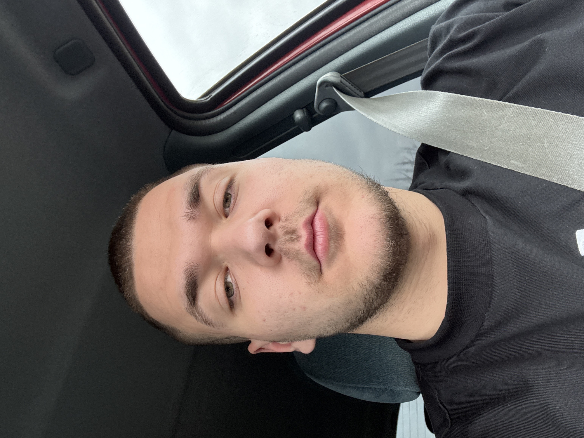 A male individual is depicted seated inside a vehicle, positioned within the city of Enitsa, Bulgaria. The subject, appearing to be an adult male, has short, dark hair and facial stubble. He is wearing a black, long-sleeved crew-neck shirt and a light grey seatbelt is secured across his torso. The subject maintains a direct gaze towards the camera. The vehicle's interior features a dark grey headliner and black pillar trim. A red exterior body panel is partially visible along the passenger side window frame. The sky visible through the passenger window appears overcast. A dark grey or blue-grey seat headrest is visible behind the subject's left shoulder.