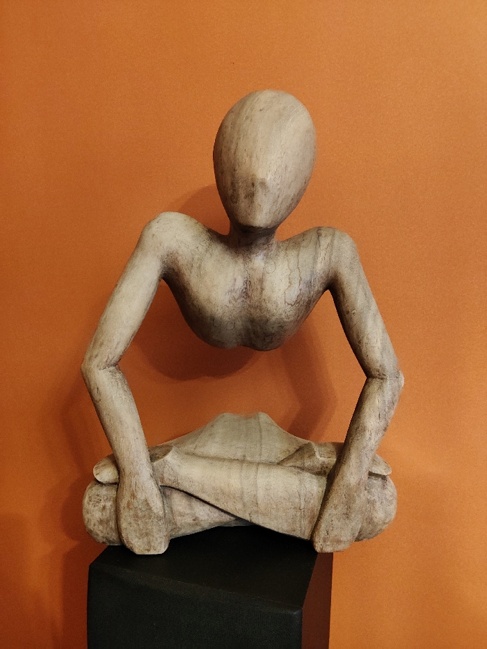 A light-colored wooden sculpture of a stylized human figure is centrally positioned against a solid orange wall, indicative of an interior setting in Moscow, Russia. The sculpture depicts a limbless torso with a featureless, oval head and slender arms, seated in a cross-legged posture. The torso appears to hover above the legs due to the design, with no visible connection between the upper and lower body. The figure's forearms rest on its knees or thighs. The wood displays a visible grain pattern, suggesting a natural finish. The sculpture rests on a matte black, rectangular plinth or base, which is partially visible at the bottom center. Soft lighting illuminates the scene, casting subtle shadows to the right of the sculpture and base against the orange background.