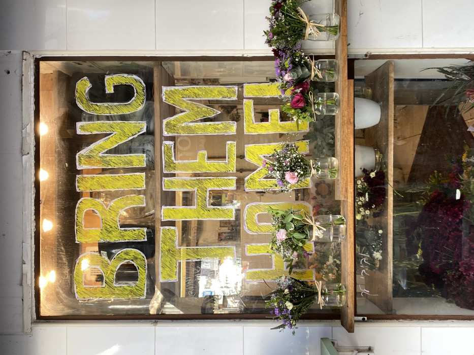 The image displays a storefront window in Tel Aviv, Israel, framed by white ceramic tiles on either side and a distressed white painted lintel overhead. Applied to the interior surface of the glass, the phrase "BRING THEM HOME!" is prominently featured in large, hand-drawn yellow block letters with white outlines, facing outwards. Three bare incandescent light bulbs are visible along the top interior edge of the window frame. A horizontal wooden shelf crosses the window's mid-section, upon which six small bouquets of mixed flowers are displayed. Each bouquet is arranged in a clear glass jar filled with water and secured with natural-colored twine around its neck. The bouquets contain various blossoms and greenery, including purple, pink, and white flowers. Below this shelf, the interior of a flower shop is visible, showcasing additional floral arrangements, pots, and a lower wooden shelf with dark red/purple blooms. Reflections of the exterior environment are present on the window glass. No people are visible.