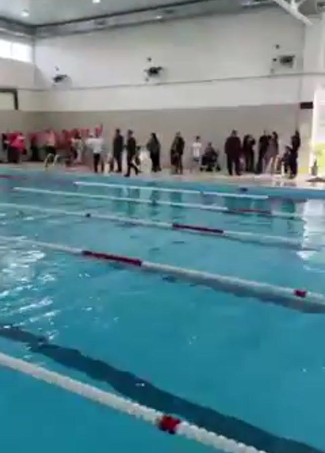 n indoor swimming pool with lane markers dividing the pool. A group of people, some dressed in swimming attire, are gathered at the far end of the pool near the starting blocks. Some appear to be coaches or spectators. There is a lifeguard standing near the side. A row of triangular flags decorates the wall behind them. Sunlight filters through large windows. The camera pans slightly across the scene.