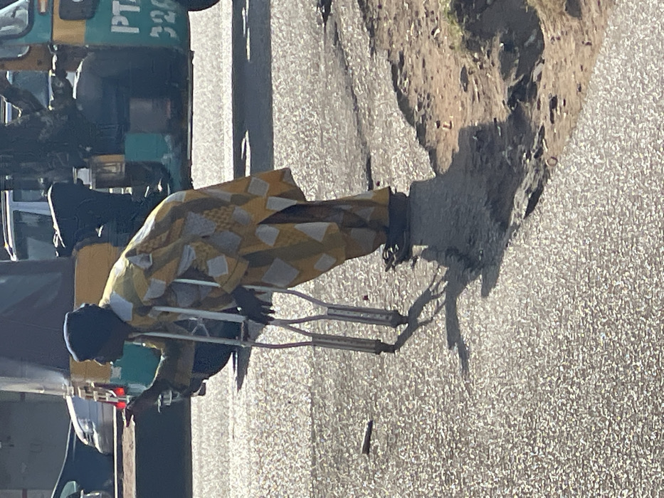 A person with a cane and a patterned yellow and white cloth is walking on the street near the left side of the image. There is a vehicle in front of the person. The area on the right side of the image is a sidewalk with dirt and grass.