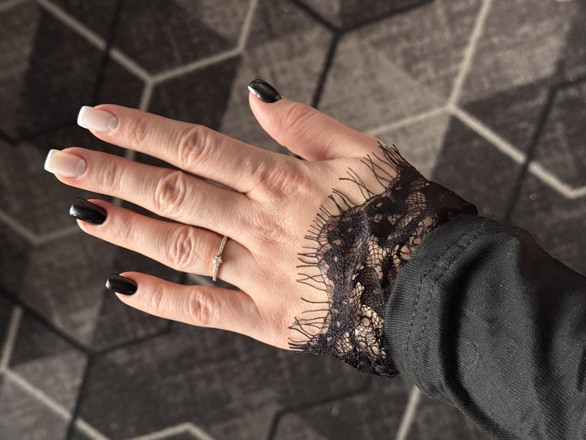A woman's hand is presented against a backdrop of geometric patterns. Her nails are manicured with a combination of black and white french tips. A diamond ring adorns her ring finger. A black lace sleeve is visible at her wrist. The image's location is not discernible and therefore, cannot be identified as Donetsk, Ukraine.