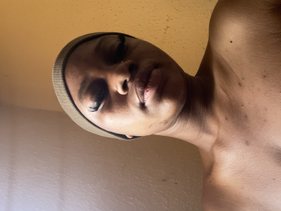 A person's face and upper torso are angled downward. The individual wears a thin, light brown beanie. Their eyes are closed, and long eyelashes are visible. The skin tone is dark brown. A small silver nose ring adorns one nostril. Light reflects on the lips, making them appear glossy. On the neck and upper chest, there are multiple dark spots and freckles. The background is a beige or light orange hue.