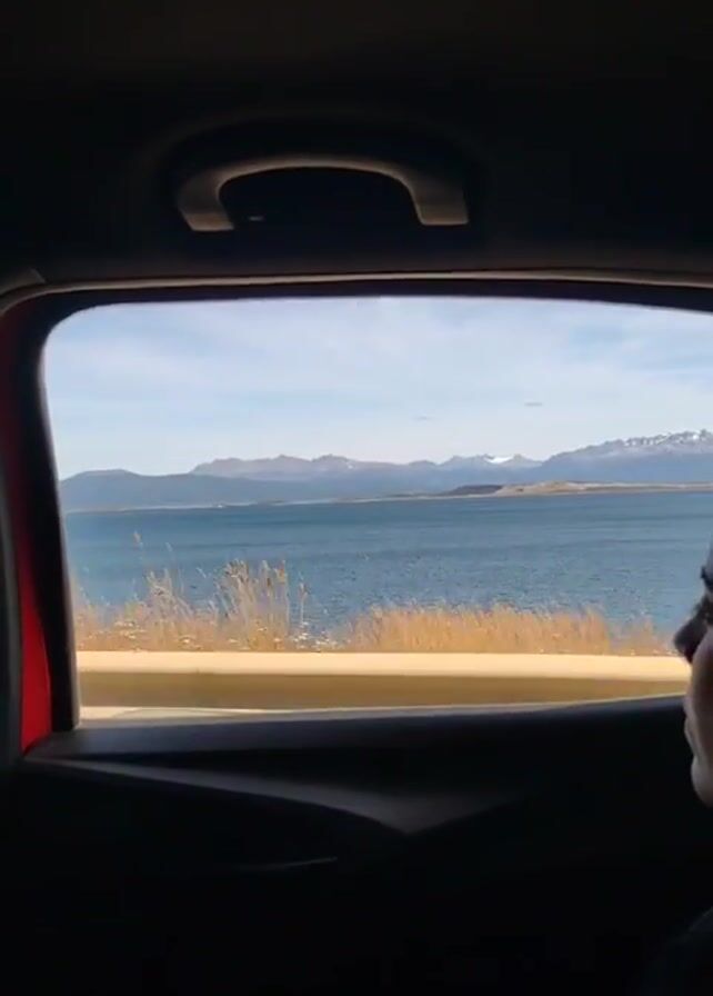 From the back seat of a moving vehicle, a woman looks out the window at a view of water and distant mountains. The mountains appear to be snow-capped. The woman is on the right side of the frame, with her hair pulled back. The road outside the window is lined with a yellow barrier. The sky is blue with some clouds. The interior of the car is dark.