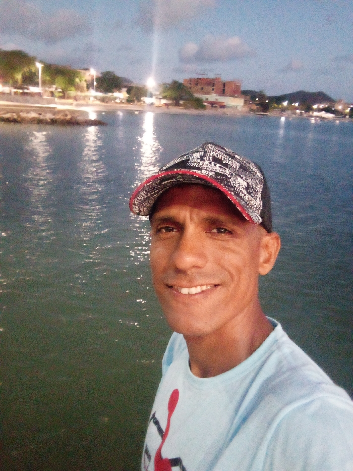 A man smiles for a selfie, wearing a patterned cap and light blue t-shirt with a design on it. He stands near a body of water at dusk or dawn, possibly an ocean or bay, with reflections of lights on the water surface. Across the water, there are buildings and hills, suggesting a populated coastal area. The lighting suggests it's either early morning or late evening.