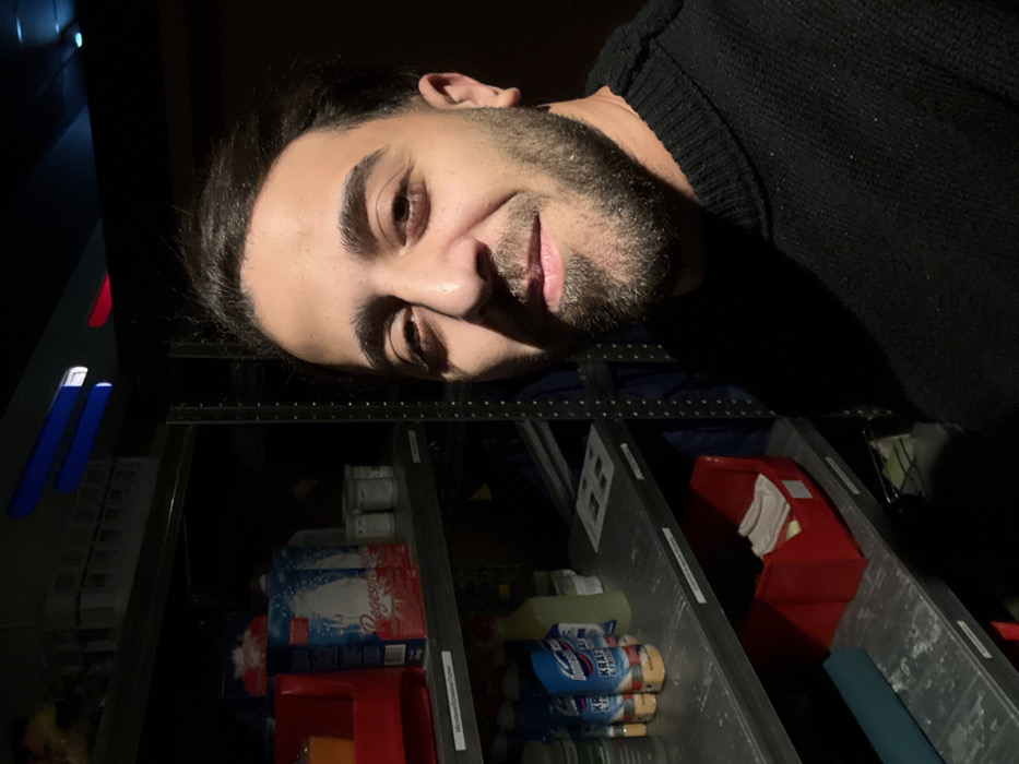 An indoor scene in a storage area within the city of Remscheid, Germany, is depicted. A male individual with dark hair and a beard, wearing a dark-colored knitted sweater, occupies the right half of the frame. He is positioned facing forward, slightly smiling, with direct eye contact towards the camera, suggesting a self-portrait. To the left and behind the individual is a multi-tier metal shelving unit. The shelves are stocked with various items. On the upper shelf, multiple white rectangular containers, a red plastic storage bin, and several packages resembling laundry detergent (one prominently displaying "Regesol") are visible. The middle shelf holds numerous cleaning product bottles, including several with blue and white branding (e.g., "KRAFT&FRISCHE"), a yellow plastic bottle, and other unidentifiable containers. Another red plastic storage bin containing white fabric or paper items is also present on this shelf. The bottom visible shelf contains a rolled-up teal-colored object. The overall lighting is dim, with direct illumination on the subject's face from the right. Overhead, in the dark background, two illuminated horizontal light fixtures are visible, one appearing blue and the other white with a red element. The shelving unit's dark metal frame is visible along the left edge and extending into the background.