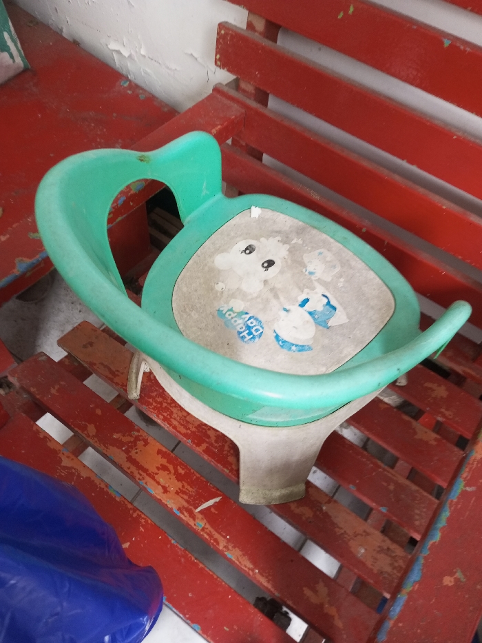 - "A child's potty trainer is situated on a weathered, red-painted wooden slatted bench" by FM-B8aSi2, licensed under CC BY 4.0
