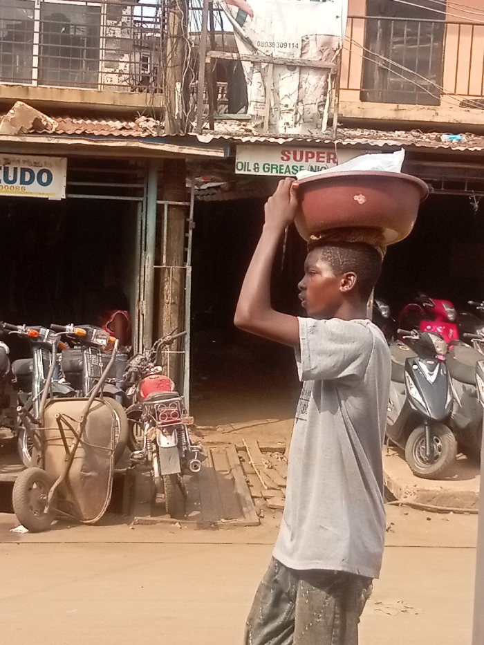 A young male is depicted in profile, facing right, carrying a brown plastic basin on his head, stabilized by both hands