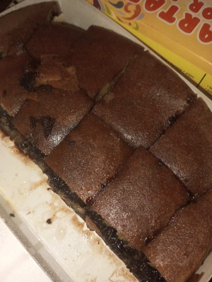 A rectangular sweet pancake-like confection is presented in a white, possibly disposable, container. The confection is dark brown, appears slightly glossy, and has been uniformly cut into eleven visible square portions, with one additional portion in the upper left appearing broken or partially removed. Visible within the cuts and on the surface of some pieces are a dark filling, likely chocolate or a similar spread, along with scattered chocolate sprinkles and lighter colored inclusions. The bottom of the container shows traces of crumbs and a dark, viscous residue from the confection. A yellow and orange cardboard box with white lettering, partially displaying "ARTA" and "OR", is visible in the upper right background. The scene is illuminated by ambient artificial light. The location is Tangsibi, Bhutan.