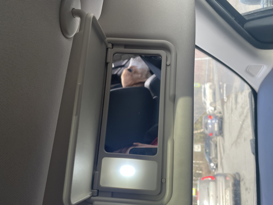 The image depicts the interior of a vehicle, looking forward through the windshield. Prominently featured is the passenger-side sun visor, lowered and with its vanity mirror open and illuminated by a bright rectangular light on the left side of the mirror frame. Reflected in this vanity mirror is the upper body and head of a person with dark hair, visible from the back, wearing a red collar or garment. To the right of the person's reflection, the head and neck of a tan and white dog, consistent with a Beagle breed, are visible, facing to the right of the frame. Through the windshield, a street scene is visible under daylight conditions. The vehicle is stationary or moving slowly in traffic on what appears to be an asphalt road. Directly ahead, the rear of a silver or grey SUV is partially visible, displaying a Russian license plate with the region code "178," which corresponds to Saint Petersburg, Russia. Further down the road, additional vehicles are visible, including a dark blue hatchback/sedan, a white SUV/crossover, and a darker sedan. The road appears to have some scattered debris or wet patches. On the right side of the road, bare trees suggest a late winter or early spring season, and a yellow triangular road sign with a black border is discernible in the background. The scene is located in Pargolovo, within the Saint Petersburg region of Russia, as indicated by the license plate.