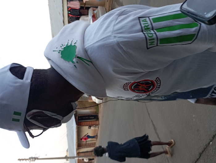 The image depicts an outdoor scene in Jos, Nigeria, likely a street or an open commercial area during daytime. In the immediate foreground, facing away and slightly to the left, is an individual with dark skin, wearing a white baseball cap featuring two horizontal green stripes on the front, a white face mask, and eyeglasses. Black wired earphones are visible around the left ear. The individual wears a white hooded sweatshirt; the hood displays a green, paint-splatter-like design. On the left side of the sweatshirt, a circular logo is partially visible, containing text such as "HOTCC" and "BASKETBALL." The right sleeve features a shield-shaped patch with the word "NIGERIA" above vertical green and white stripes, resembling the Nigerian flag. In the midground, to the left of the main subject, a young child, seen from the back, walks away. The child wears a dark top, a dark skirt, and light-colored flat shoes. The ground beneath appears to be paved asphalt. The background features several single-story structures with corrugated metal roofs, typical of commercial or residential buildings in the region. Some clothing items are displayed outside one building, suggesting a market stall. A light-colored vehicle is partially visible between the buildings. A utility pole with wires stands on the left side of the frame. Scattered human figures are present further in the background, including one person wearing a red top. The sky is bright and appears overcast or hazy.