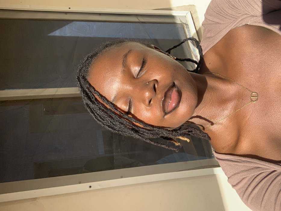 A young adult female, with dark skin and black dreadlocks, is depicted in a close-up portrait