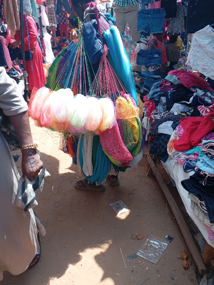The image displays an outdoor market scene in Nyanya, Nigeria, under bright daylight. A central figure, appearing to be a vendor, is positioned facing slightly right, carrying a substantial quantity of merchandise. This individual wears a dark blue long-sleeved top and dark-colored sandals. Around their upper body and waist, numerous items are suspended by strings: a prominent, circular arrangement of approximately 15-20 spherical, mesh-like bath sponges in various pastel colors including pink, light green, white, and yellow is visible at chest height. Below these, a dense collection of long, folded or rolled fabric items, possibly scarves or nets, in vibrant hues of blue, pink, green, orange, and turquoise, also hangs from strings. To the immediate left, a partially visible person stands, wearing light-colored, possibly beige, flowing attire and dark sandals. This individual's right arm is visible, adorned with a gold-toned watch, and they hold a striped fabric item. To the right, a market stall is present, featuring large, haphazard piles of assorted clothing items, including denim shorts, t-shirts, and various colored fabrics. These garments rest on a simple wooden support structure. In the background, additional clothing items hang on display, and indistinct figures suggest further market activity. The ground is unpaved, consisting of light brown dirt or sand. Scattered debris is visible on the ground, including several small, transparent plastic bags, one of which contains a white granular substance, along with pieces of torn paper and other discarded items. Shadows from figures and objects are cast prominently on the ground, indicating the sun's position.