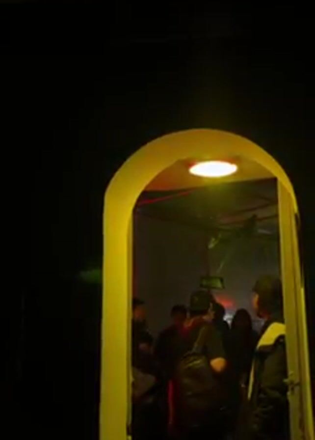 entrance to a nightclub called Scratch. The door is arched and painted yellow, and a neon sign above the door spells out the name of the club. Inside, a group of people are standing in a smoky, dimly lit room with red and green laser lights. The room seems crowded, and some people are holding drinks. The overall impression is of a vibrant nightlife scene.