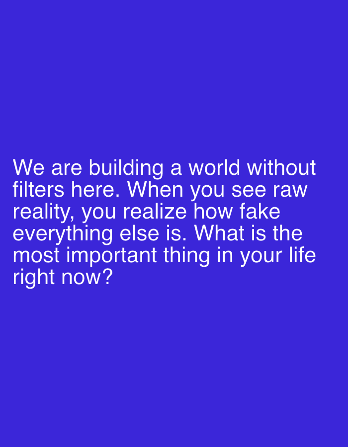 The scene is set in the city of Unknown, Unknown. The image consists of white text displayed centrally against a solid, uniform medium-blue background. No individuals, physical objects, actions, or interactions are depicted within the frame, apart from the textual content. The text reads: 'We are building a world without filters here. When you see raw reality, you realize how fake everything else is. What is the most important thing in your life right now?' The environment is limited to the monochromatic blue background.