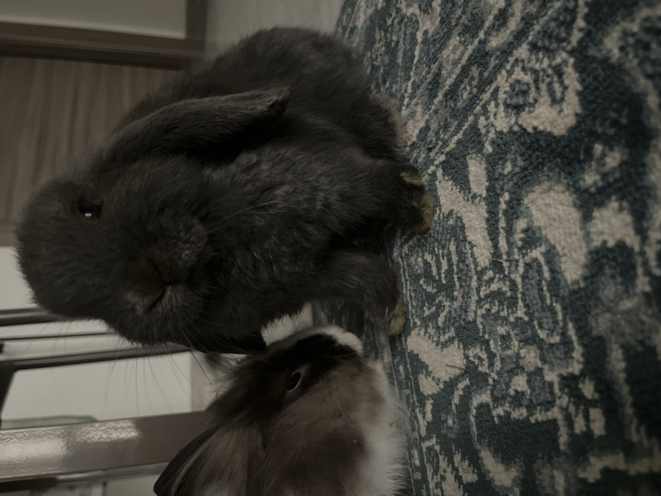 Two rabbits are positioned on a patterned rug in an indoor environment