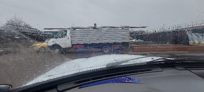 The image, captured from the interior of a vehicle through a rain-splattered windshield, depicts an outdoor industrial scene in Nazarbek, Uzbekistan. A white GAZelle-type flatbed truck with light-colored metal side rails occupies the mid-ground, loaded with several long, dark, rectangular metal beams or pipes extending over the cab. A single male individual, wearing a dark shirt, stands upright within the truck's bed, positioned near the front of the cargo. To the immediate left and partially obscured by the white truck's cab, a small, yellow utility vehicle is visible. The foreground shows the vehicle's dashboard and the lower portion of the windshield, covered with raindrops and a thin layer of what appears to be slush or dirt. The background features an extensive outdoor storage area, including numerous stacks of reddish-brown pipes arranged horizontally, and dark-colored industrial buildings with corrugated metal structures. A dark mound of earth or debris is present on the far left. The sky is overcast, and the ground appears wet and muddy.