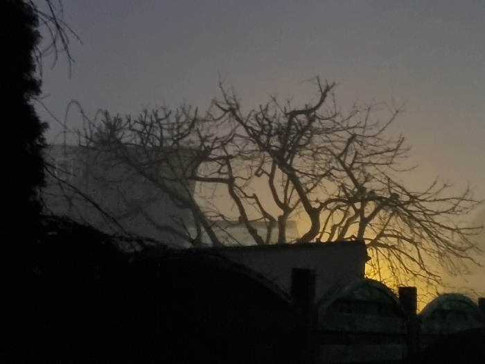 A silhouette of a bare tree in the foreground against a hazy backdrop. Behind the tree, a building with a flat roof is vaguely visible, and the background has an eerie, yellowish glow. The overall atmosphere is mysterious and somewhat bleak, possibly due to fog or low light conditions obscuring details. A dark mass dominates the lower portion of the image.