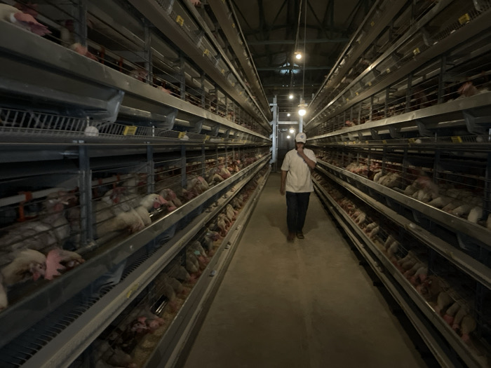 The image displays an interior view of a commercial poultry farm in Shuyene Vosta, Afghanistan