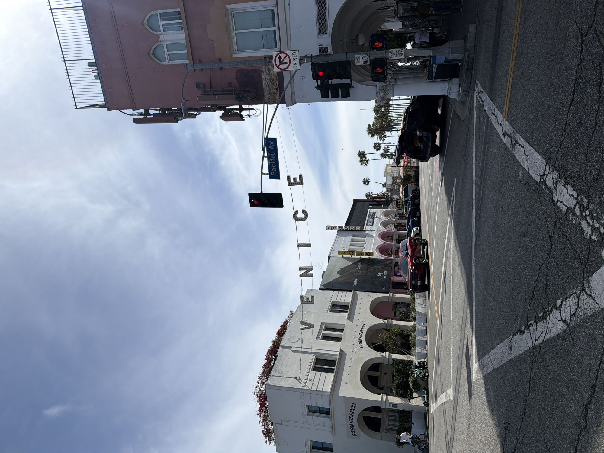 The image depicts a street view, likely in the Venice Beach area of Los Angeles, United States, as indicated by the street sign reading "Pacific Av" and the "Venice" signage on buildings