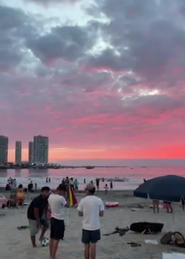 beach scene at sunset. A group of people are gathered on the sandy beach, some standing and talking while others are playing in the water. There are several beach umbrellas providing shade. The sky is filled with clouds, illuminated by the setting sun in shades of pink and purple. In the background, tall buildings are visible along the coastline.